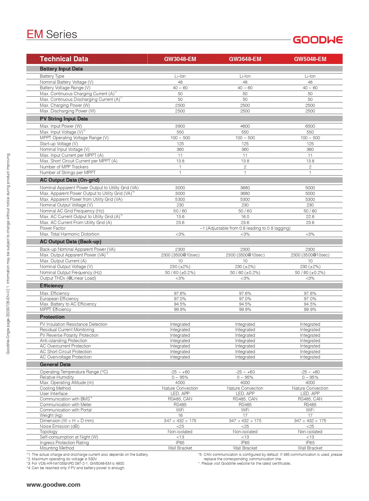 *1: The actual charge and discharge current also depends on the battery. *2: Maximum operating dc voltage is 530V. *3: For VDE-AR-N4105&NRS 097-2-1, GW5048-EM is 4600. *4: Can be reached only if PV and battery power is enough. | *5: CAN communication is configured by default. If 485 communication is used, please replace the corresponding communication line. *: Please visit GoodWe website for the latest certificates. |